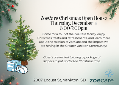Come for a tour of the ZoeCare facility, enjoy Christmas treats and refreshments, and learn more about the mission of ZoeCare and the impact we are having in the Greater Yankton Community!